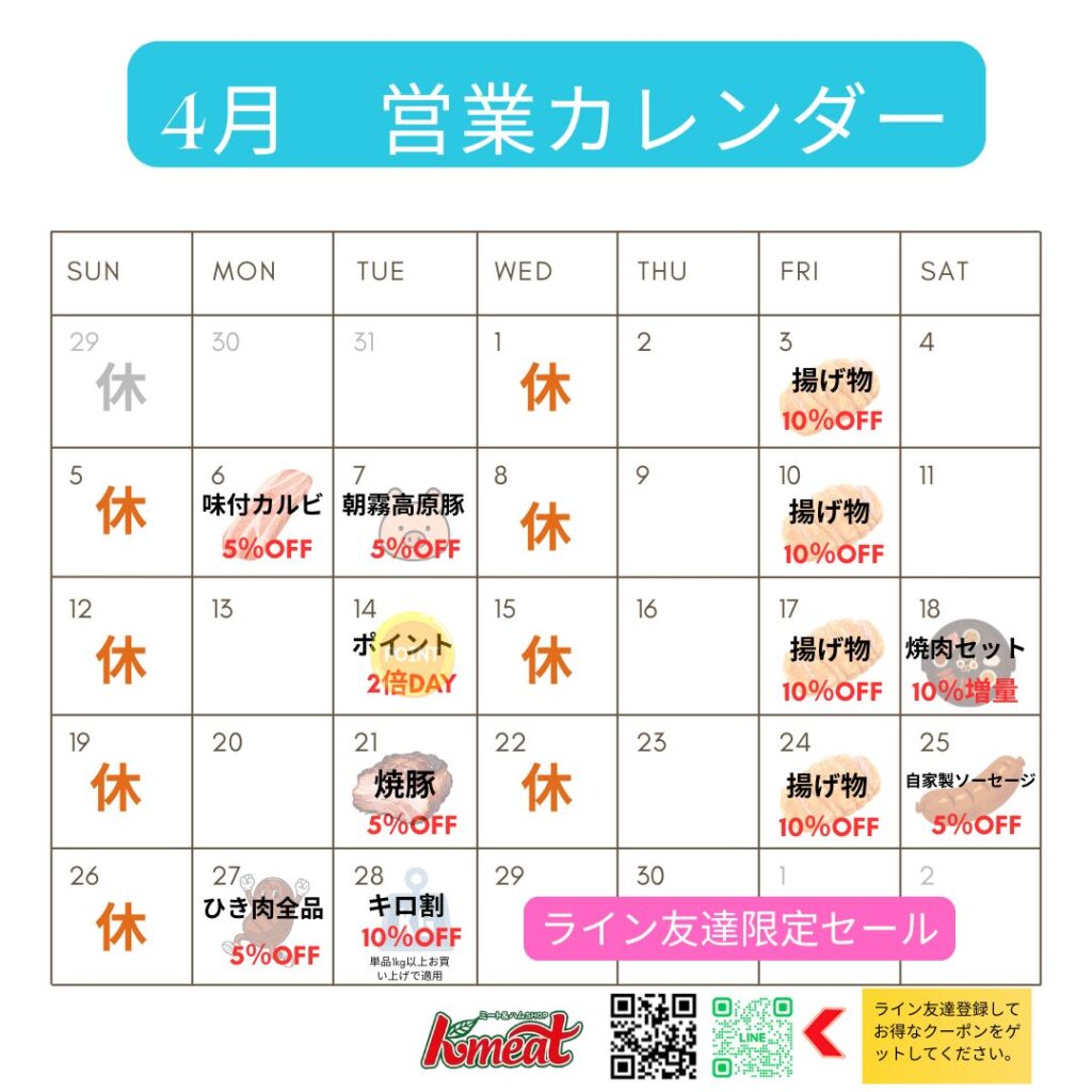 4月の営業カレンダーになります。